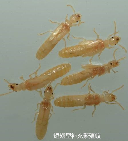 稱為補充繁殖型。白蟻群體久居住在一個地方,常造成食料不足,迫使部分工蟻和少量兵蟻離開主群體遠去尋食找水。隨著時間推移和距離的遠離,再加上其它外界因素的影響,結果使它們與主群體完全失去聯系。這時它們即組成小群體,然后群體內部就能產生補充型蟻王和蟻后,而成為獨立群體。另外,當原始蟻王、蟻后死亡后,短翅型蟻王、蟻后作為補充出現,延續整個白蟻群體的繁衍。